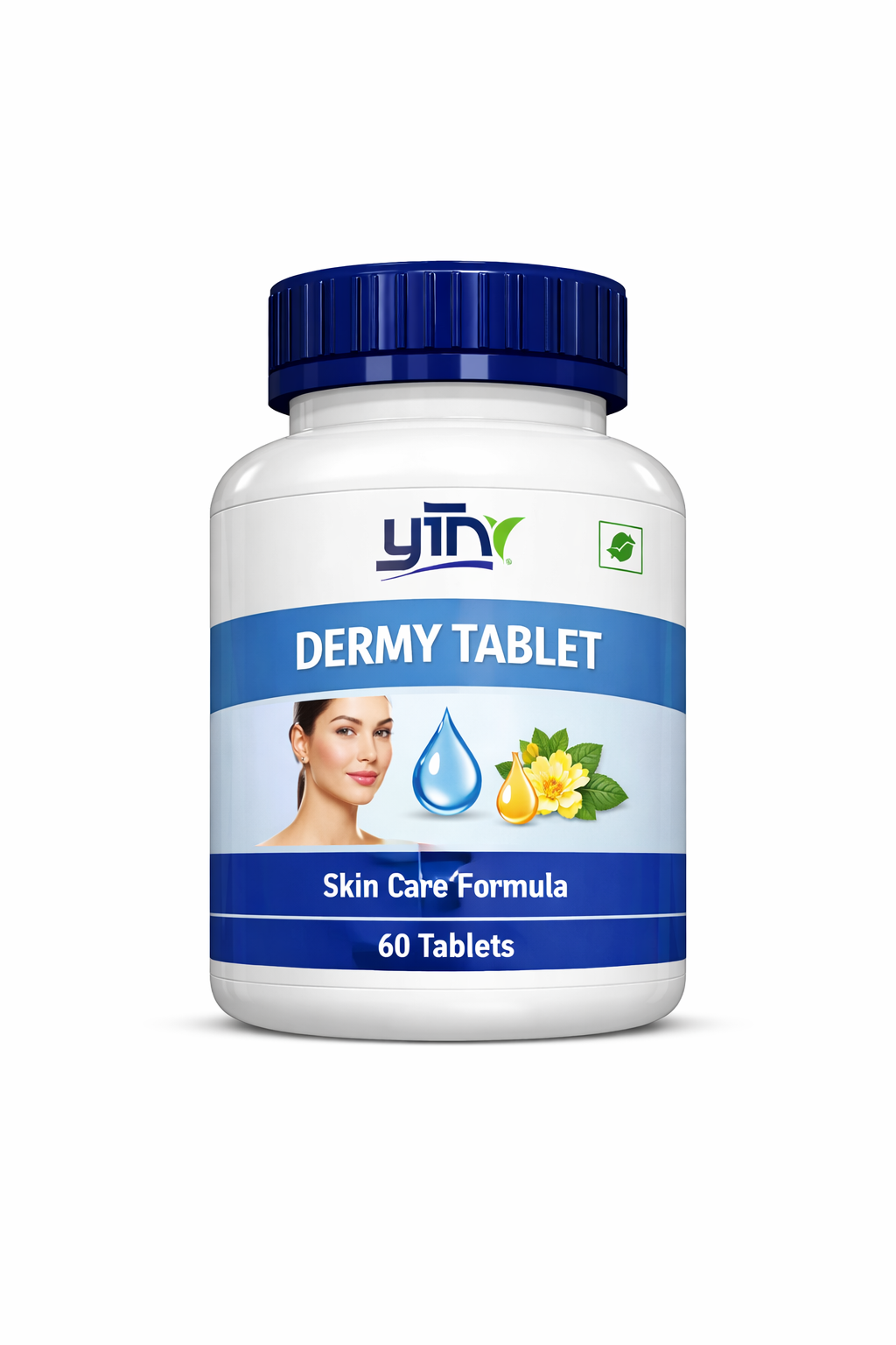 - Middle Section: Blue background, bold white text — DERMY TABLET